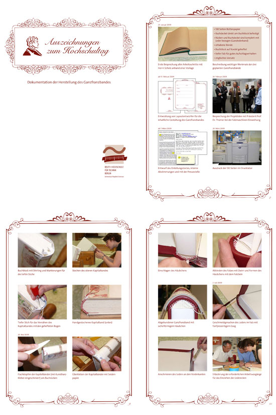 Dieser Ganzfranzband ist im Studiengang Druck- und Medientechnik an der Beuth Hochschule für Technik Berlin entstanden. Das Projektteam bestand aus den Studierenden Vera Koch, Thomas Ritter und Heike Rose. Für die fachliche Betreuung war Buchbindermeister Rainer Scholz verantwortlich. Ausführlich dargestellt ist das Projekt in untenstehender Dokumentation.