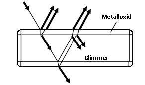 Die deutlichste Abgrenzung zur Heiß- oder Kaltfolienprägung entsteht durch das Beigefügen von Metallglimmer, welcher unregelmäßig im Lack verteilt ist. Dies führt zu variierenden Reflektionswinkeln und liefert somit hohe Brillanz und optische Tiefe. Metallicfarben werden daher „lebende“ Farben genannt.
