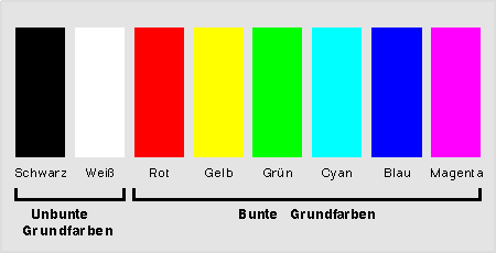 sind Rot, Grün, Blau, Cyan, Magenta, Gelb, Weiß und